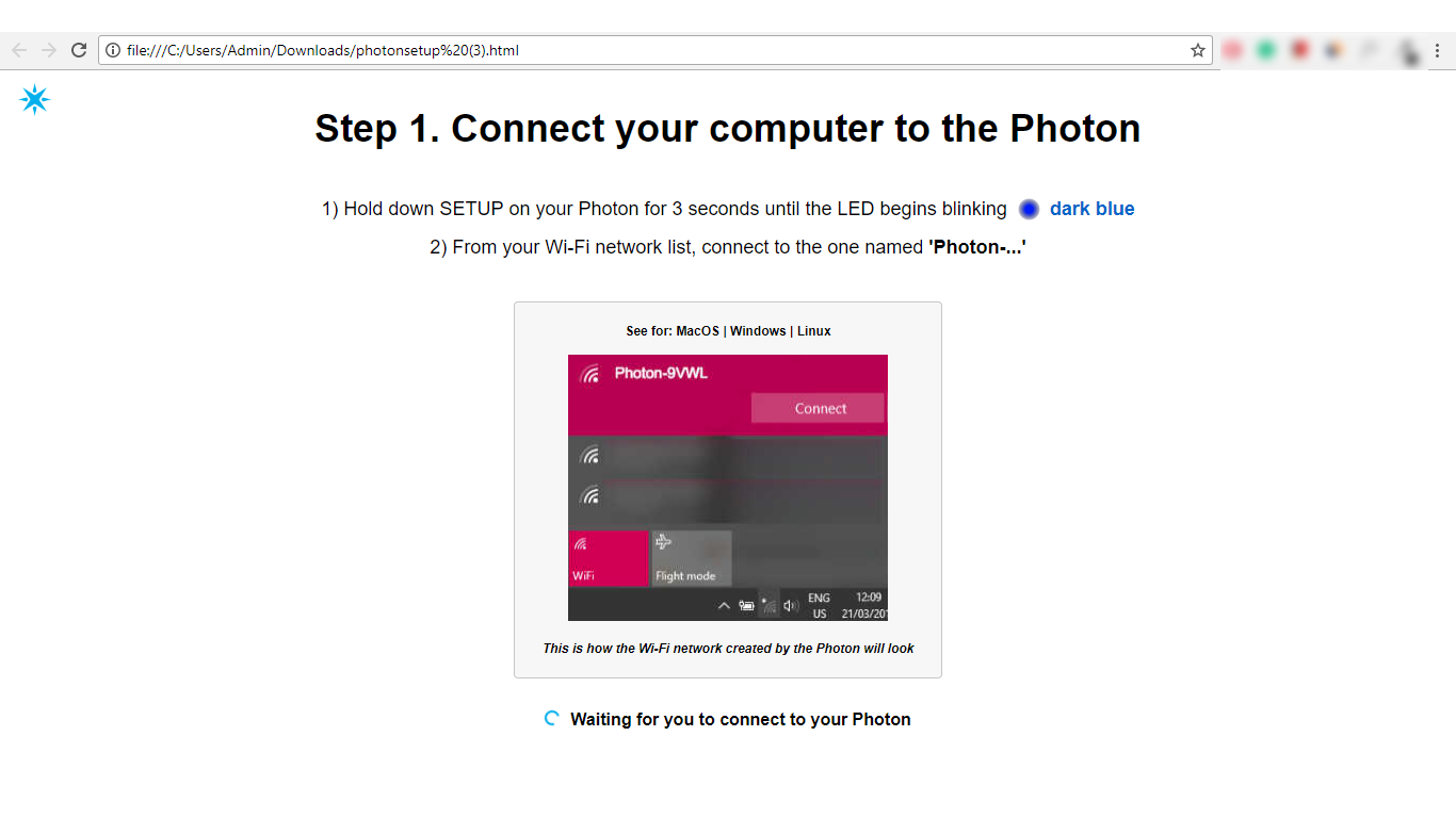- Open the file (photonsetup.html) and Connect your PC to the Photon, by connecting to the network named PHOTON-...