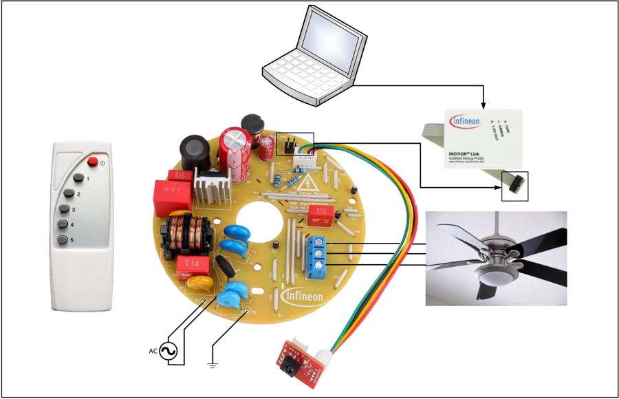 The iMOTIONTM link cable is needed to bridge the PC/debugger side and motor drive system (the target iMOTION™ device, hot side) with 1 kV DC galvanic isolation. Users can go to Section 5.3 for more information on the iMOTIONTM link.