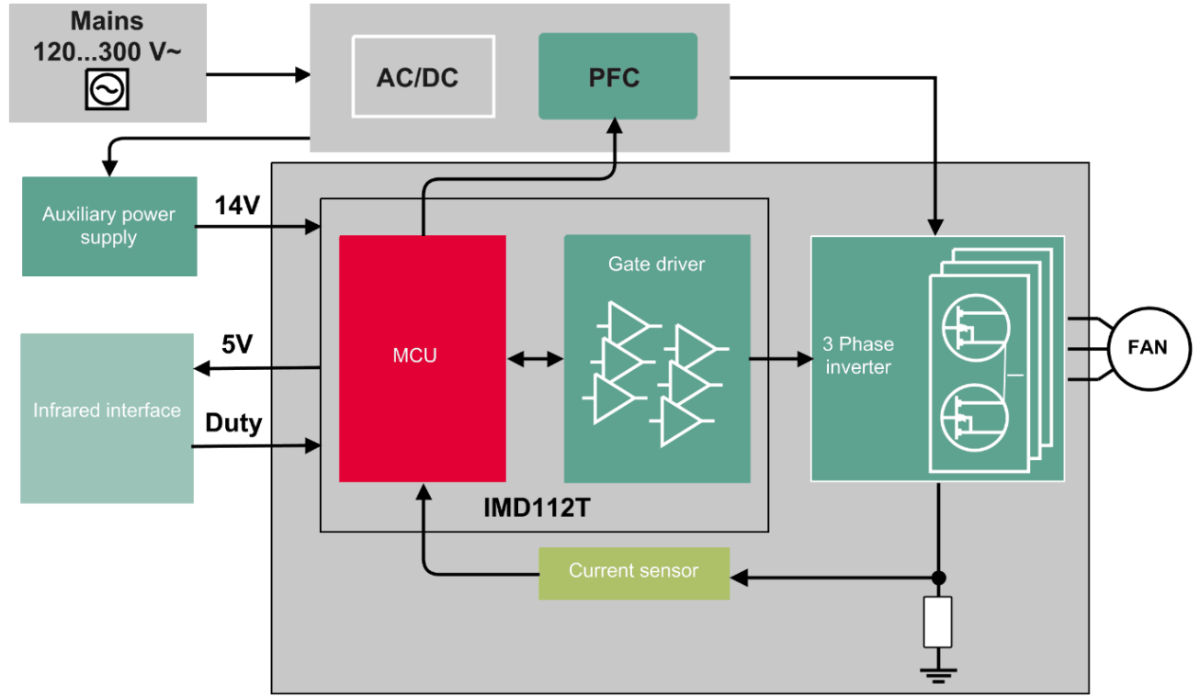Moreover a PFC (Power Factor Control) stage with IKA08N65H5 as switch plus IRS44273L as suitable gate driver and IKN03N60RC2 for the inverter stage are included as well.