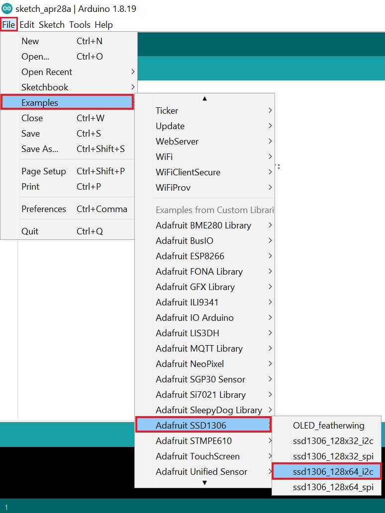 - Now open the example of ssd1306_128x64_i2c. To open it navigate to File ► Examples ► Adafruit SSD1306 ► ssd1306_128x64_i2c