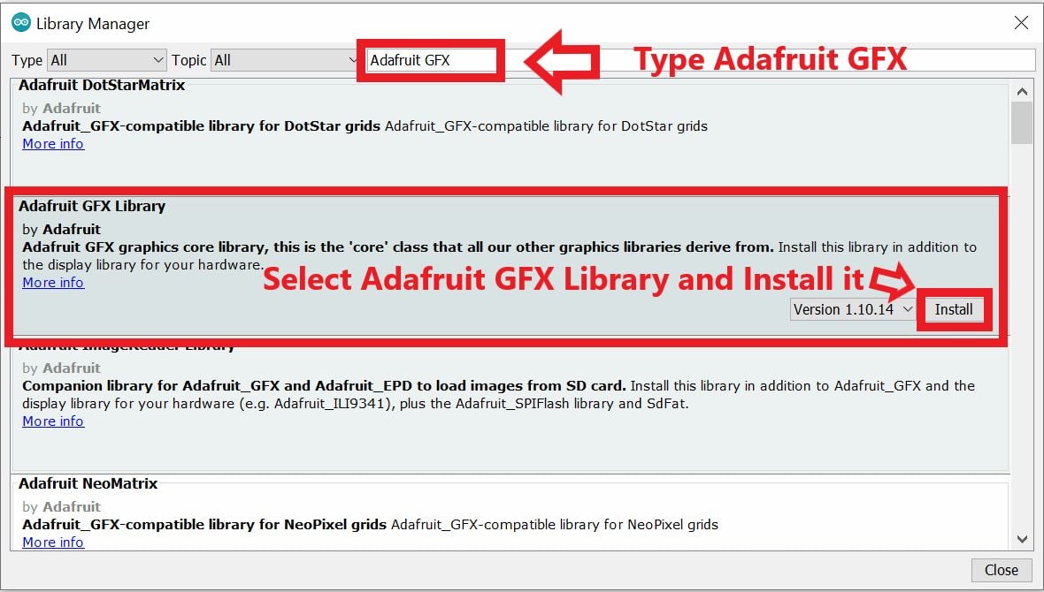 - Now enter Adafruit GFX into the search box and click Install on Adafruit GFX library (install version 1.10.14 or higher)