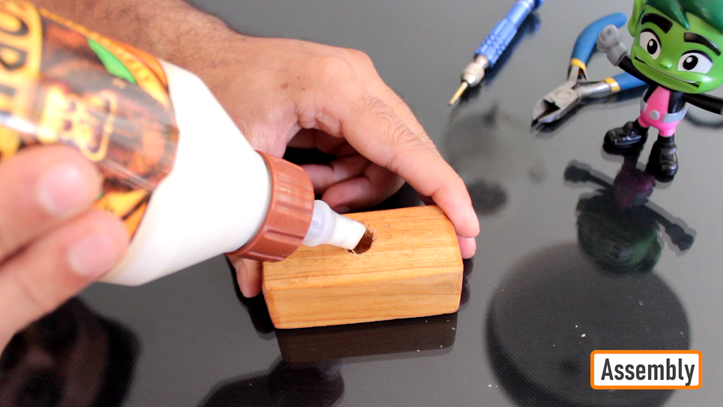 Once that was all set, I superglued the top part to the bottom part. Finally, I mounted the whole assembly on a wooden base to complete the setup.