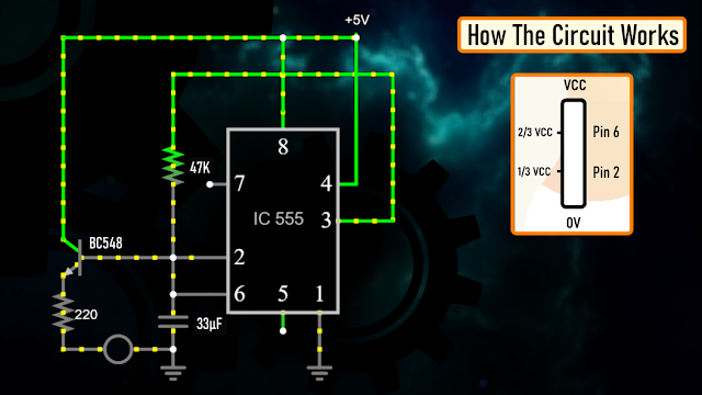 - When Pin 2 of the IC detects voltage LESS than 1/3rd of the supply voltage, it turns ON the output on Pin 3.