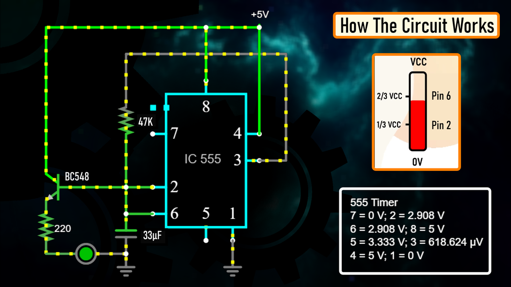 - Once the voltage across the capacitor crosses 2/3rds of the supply voltage, Pin 6 turns OFF the output.
