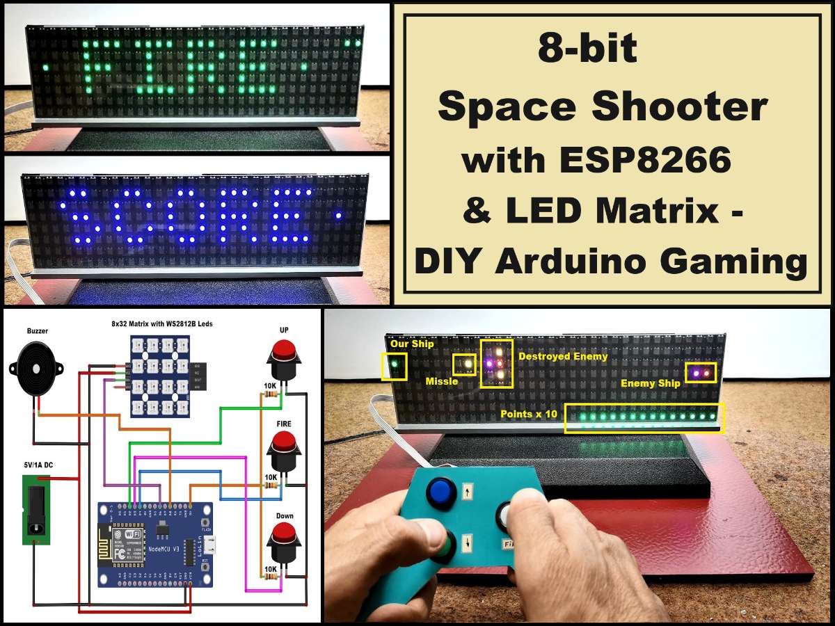 And finally a short conclusion. This is a retro-style space shooting game built using an ESP8266 microcontroller and a 32x8 WS2812B LED matrix display, controlled by three push buttons for up/down movement and firing, with a buzzer for sound effects, and programmed using the Arduino IDE with the FastLED library.
