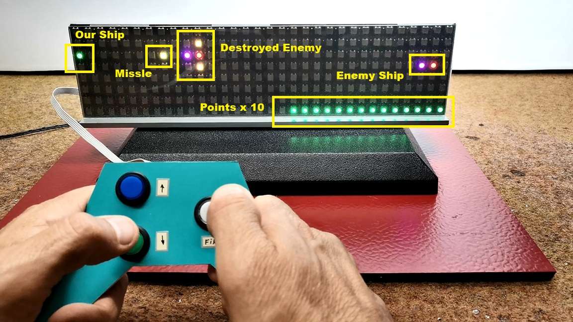 At the bottom right of the display, as many green dots appear as we have destroyed enemy ships. If an enemy ship hits our weapon, the game ends and the Game Over message appears on the display with appropriate sounds.