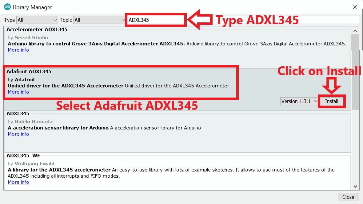 The library Manager window will pop up. Now enter ADXL345 into the search box and click Install on the Adafruit ADXL345 option to install version 1.3.1 or higher.