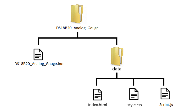 For web server building we need four different files. Arduino sketch, HTML file, CSS file, and javascript file Here we will save the HTML, CSS, and javascript files inside data folder and Arduino sketch in the Arduino folder, as shown below: