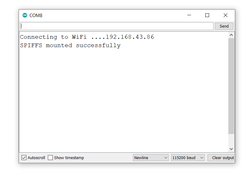 - After uploading the code open the serial monitor and set the baud rate to 115200 then reset the ESP32 board and check the IP address as shown in the below image