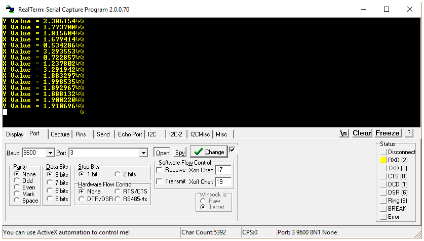 Displaying analog joystick voltages in X and Y directions on the serial monitor.