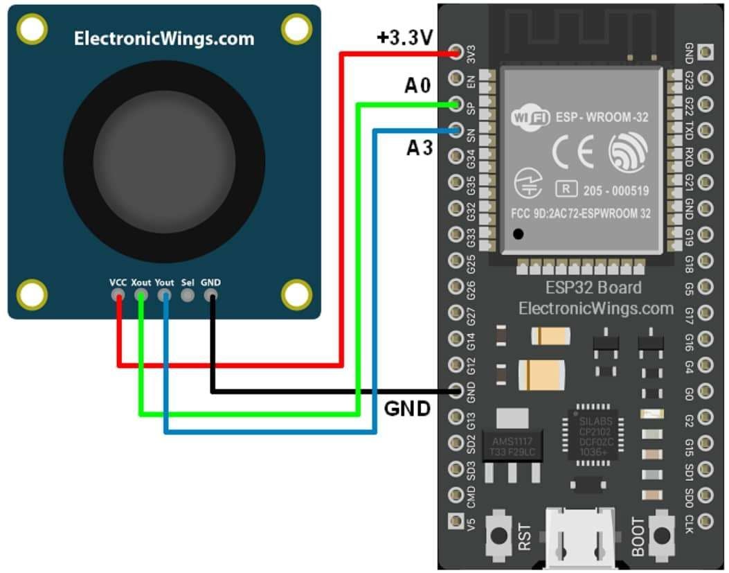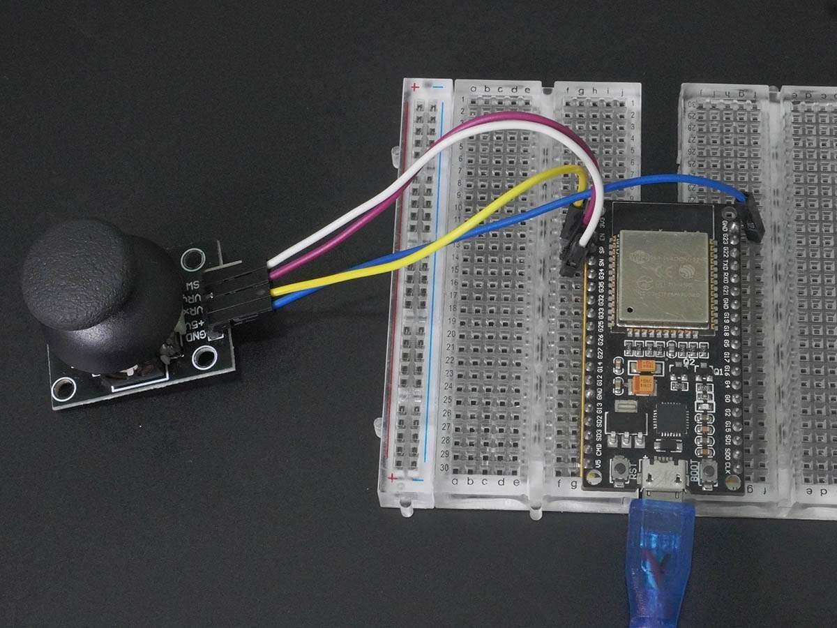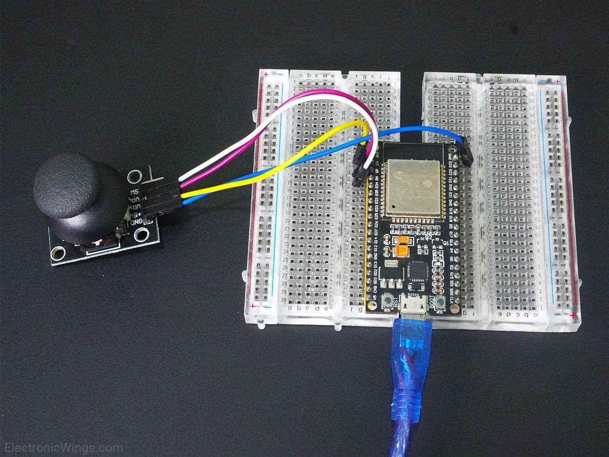 Here, we will be using the analog pins of ESP32 to process the analog voltages of the joystick.