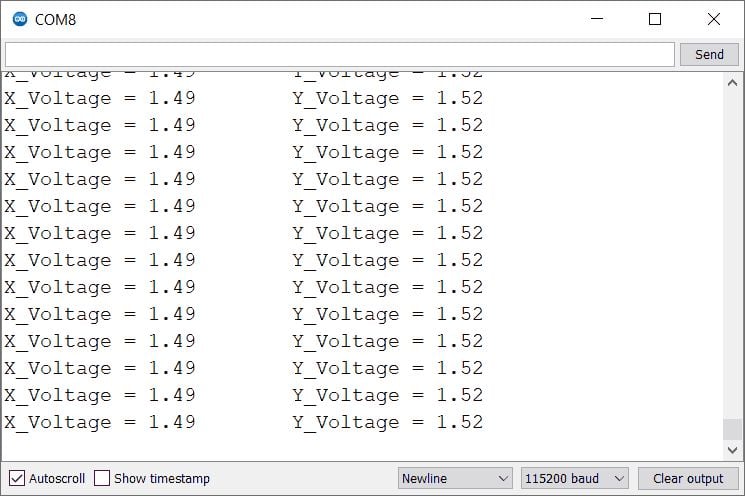 y_volt = ( ( y_adc_val * 3.3 ) / 4095 ); /*Convert digital value to voltage */Now print the X and Y Voltages into the serial monitor