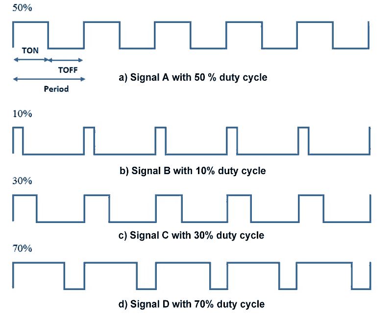 Pulse Width Modulated signals with different duty cycle are shown below