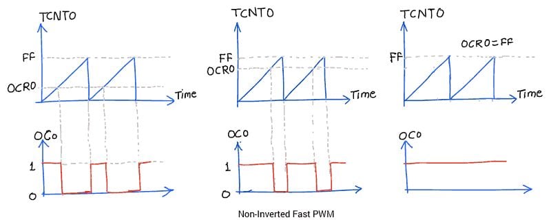 | 1 | 0 | Non-inverted | Clear OC0 on compare match, set OC0 at TOP |