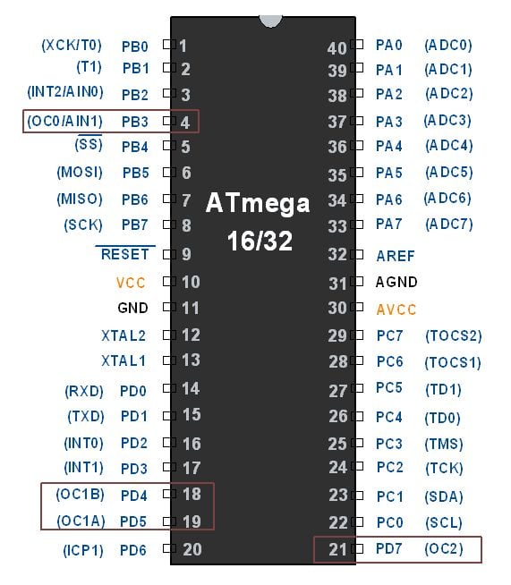 Similarly, we can set PWM output on the other three OCx pins using Timer1 and Timer2.