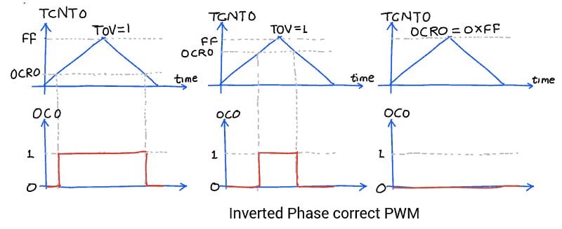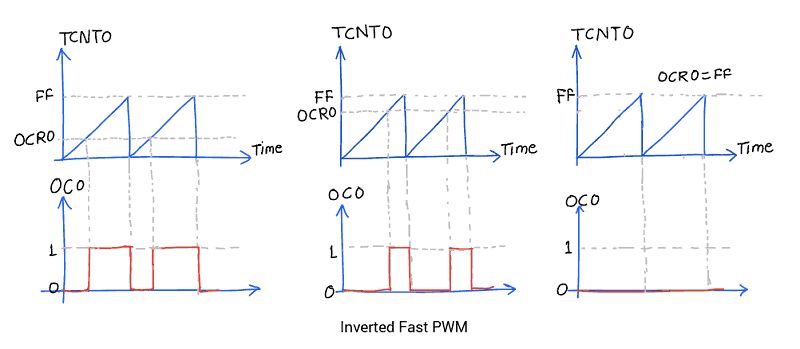 | 1 | 1 | Inverted PWM | Set OC0 on compare match, clear OC0 at TOP |