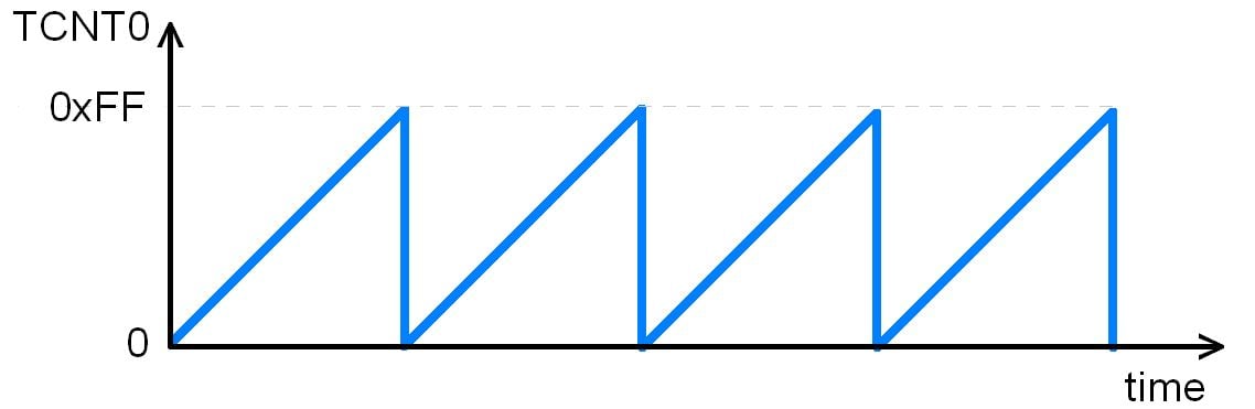Normal mode: When the counter overflows i.e. goes from 0xFF to 0x00, the TOV0 flag is set.