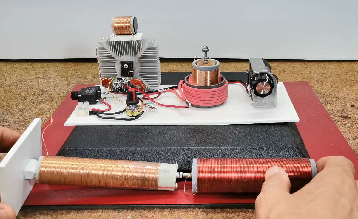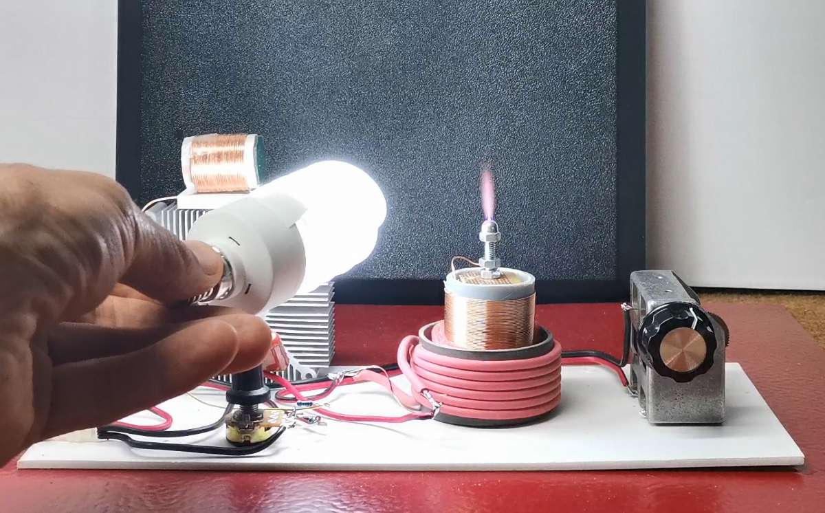 We set the voltage of the power supply to about 10-12V, and the current is limited to 1A. We set the potentiometer in the far left position and if the circuit has no errors, the current should be approximately 0. We place a CFL bulb close to the secondary coil and gradually turn the potentiometer.