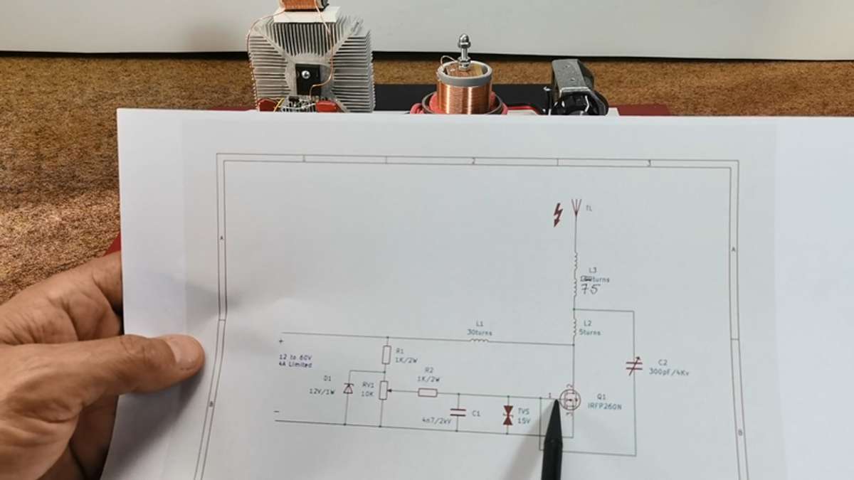 The heart of the circuit is the LC oscillator formed by L2 (2.4μH) and C2 (150pF). The values of these components determine the oscillator’s frequency. In this case, around 11MHz. The voltage divider formed by VR1 and its 1kohm series resistor generates a 5-10V signal at the gate of IRFP260N Mosfet to start the circuit oscillating. The MOSFET should be mounted on a relatively massive heat sink for efficient dissipation of the generated heat. Feedback via capacitor C2 triggers and sustains the oscillation.