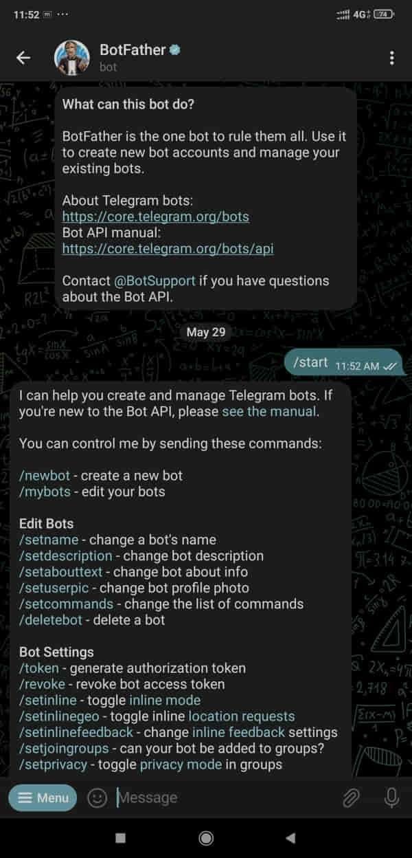 Noe find the Botfather in the result and open it and click ok start.