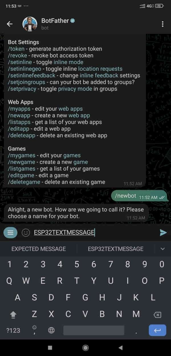 String from_name = bot.messages[i].from_name;When the receiver receives the /start message the ESP32 will send the command guidance to the user (telegram).