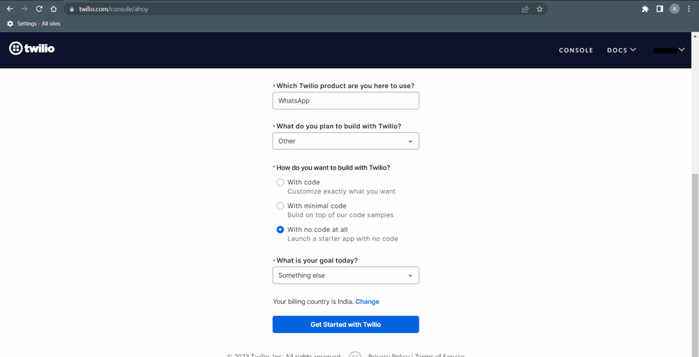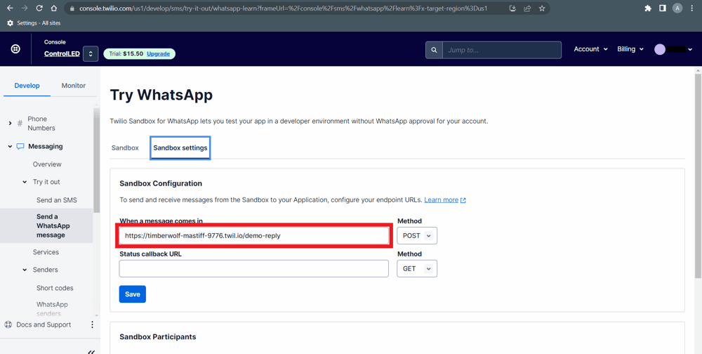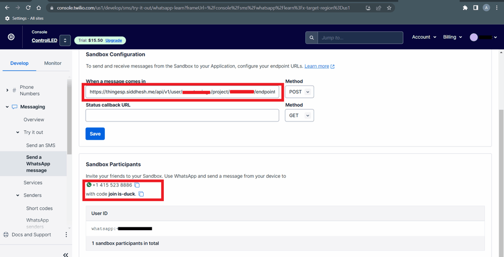 Now go to left side menu and click on Messaging-> Try it out -> Send a WhatsApp message.