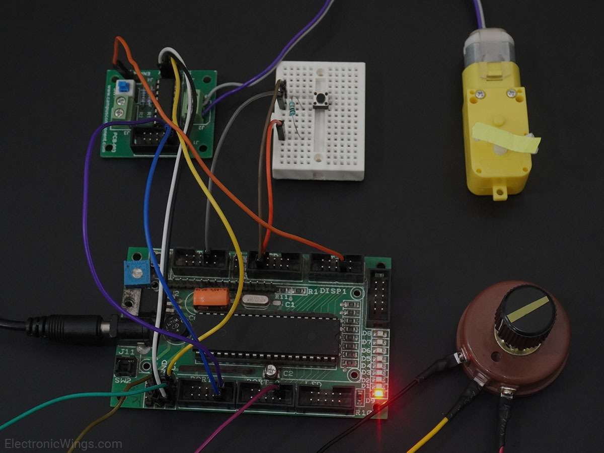- Now continuously check for the interrupt for direction and read ADC value for speed control.