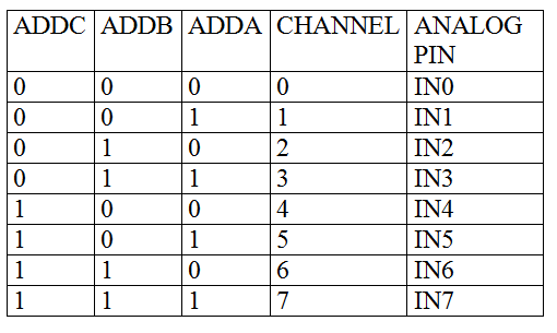 2.Select the appropriate channel by sending a signal to ADDA, ADDB, ADDC pin of ADC0808.