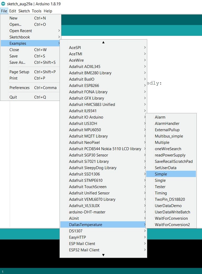 - Now open the simple example, to open it go to File ►Example ►DallasTemperature ► Simple
