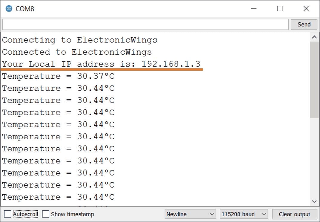 while(WiFi.waitForConnectResult() != WL_CONNECTED){Serial.print(".");}After successfully connecting to the server print the local IP address on the serial window.