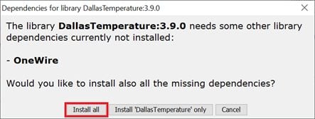 - If you don’t have the OneWire library, then this pop-up will come then click on Install all.