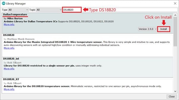 DS18B20into the search box, and click Install on theDallasTemperatureoption to install version 3.9.0 or higher. As shown below image.