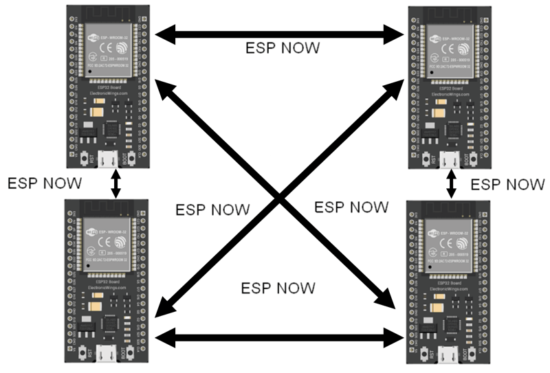 A single ESP32 board can send the same or different commands to multiple ESP32 boards. This configuration is ideal for building a remote control, where a single main board can control multiple devices around the house.