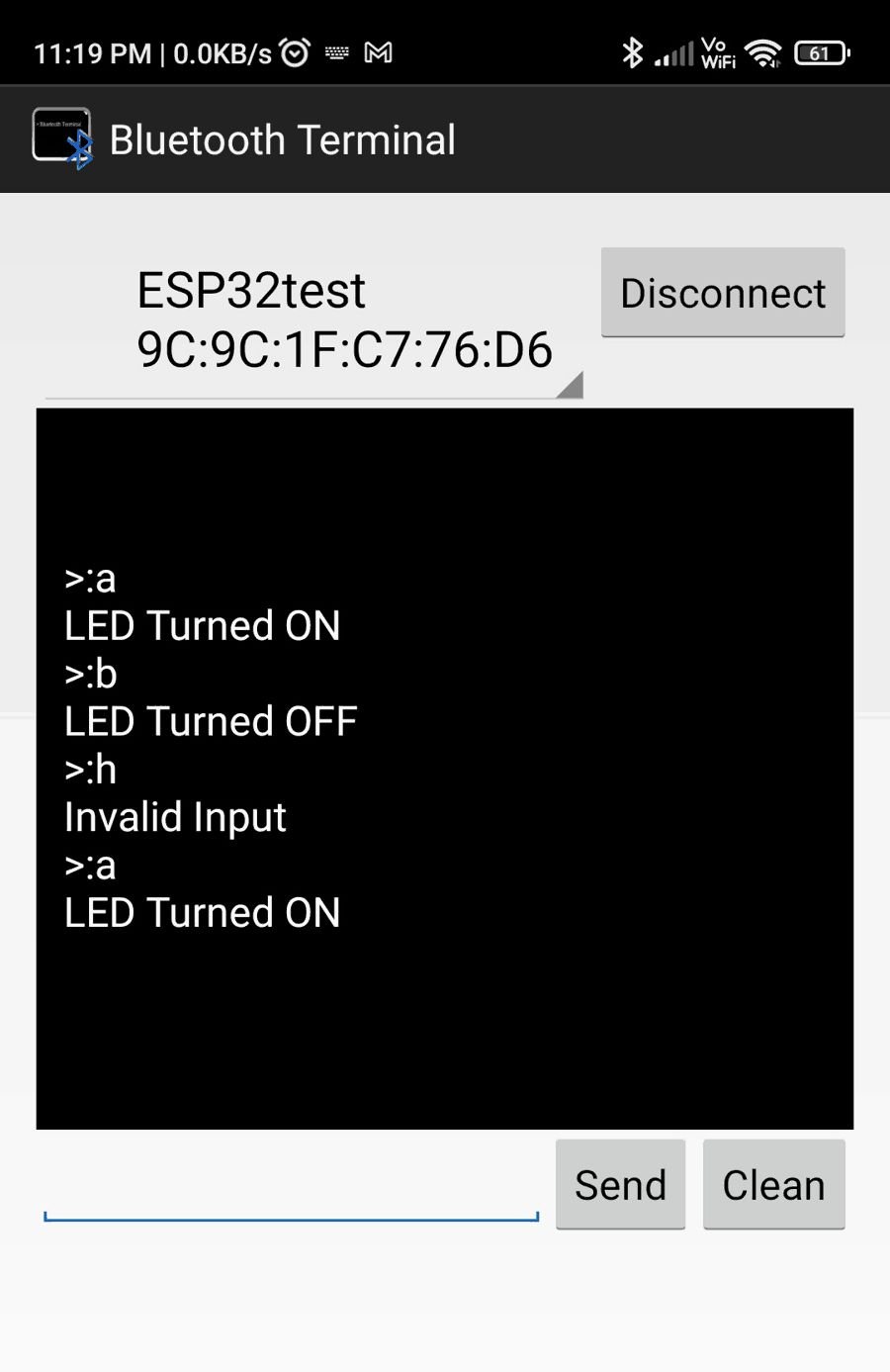 - After connecting with the ESP32test, we can type the string and send it to ESP32. Also, we can send a string to our Smartphone via ESP32 Bluetooth.