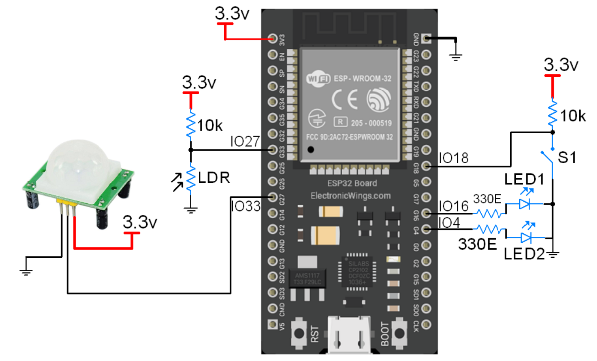 - The dashboard allows you to control the two LEDs, monitor the light intensity using an LDR (Light Dependent Resistor), and detect motion using a PIR (Passive Infrared) sensor.