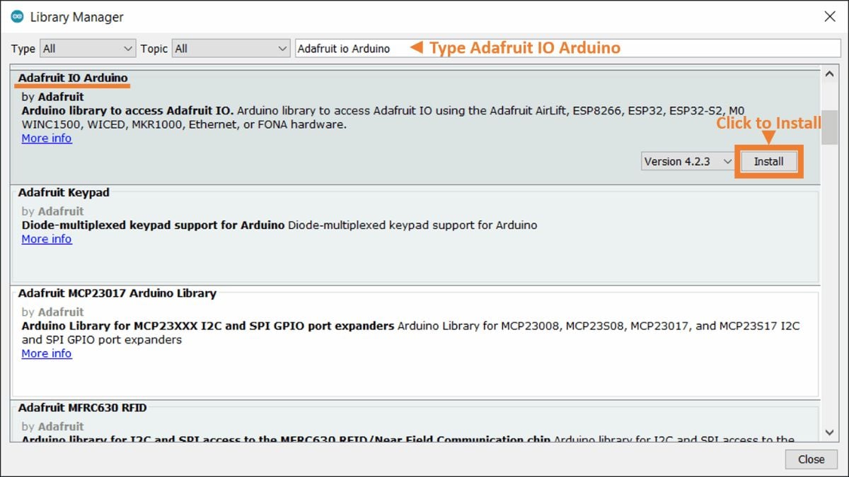 The library Manager window will pop up. Now enter Adafruit IO Arduino into the search box, and click Install on the Adafruit IO Arduino library option to install version 4.2.0 or higher.
