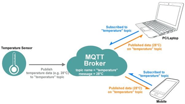 For example, if the temperature sensor publishes the temperature data (message) on the topic “temperature” then interested clients who have subscribed to the “temperature” topic get that published temperature data as shown in the above figure.