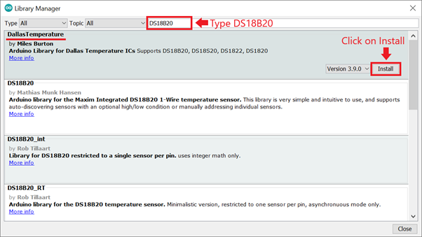 The library Manager window will pop up. Now enter DS18B20 into the search box, and click Install on the DallasTemperature option to install version 3.9.0 or higher. As shown below image.