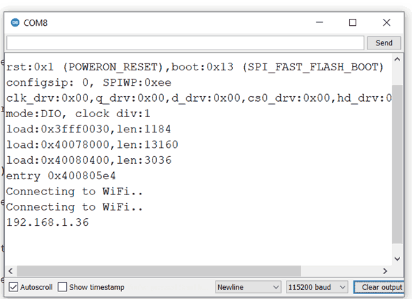 - After uploading the code open the serial monitor and set the baud rate to 115200 then reset the ESP32 board and check the IP address as shown in the below image