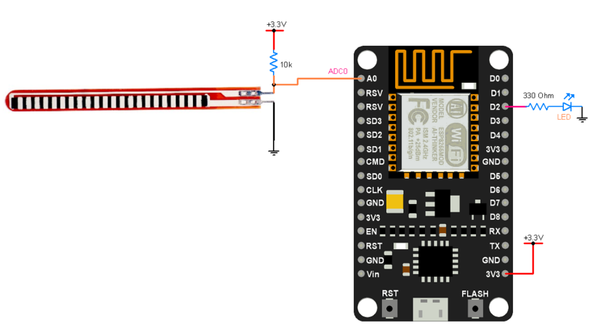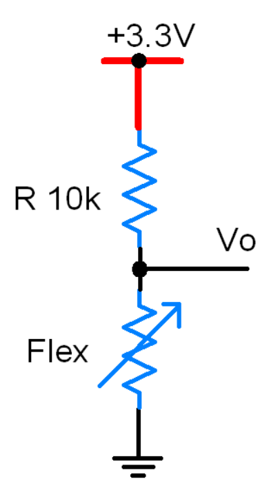 For example, the esp32 works on 3.3V so with a 3.3V supply and a 10K resistor connected in series with a flex sensor.