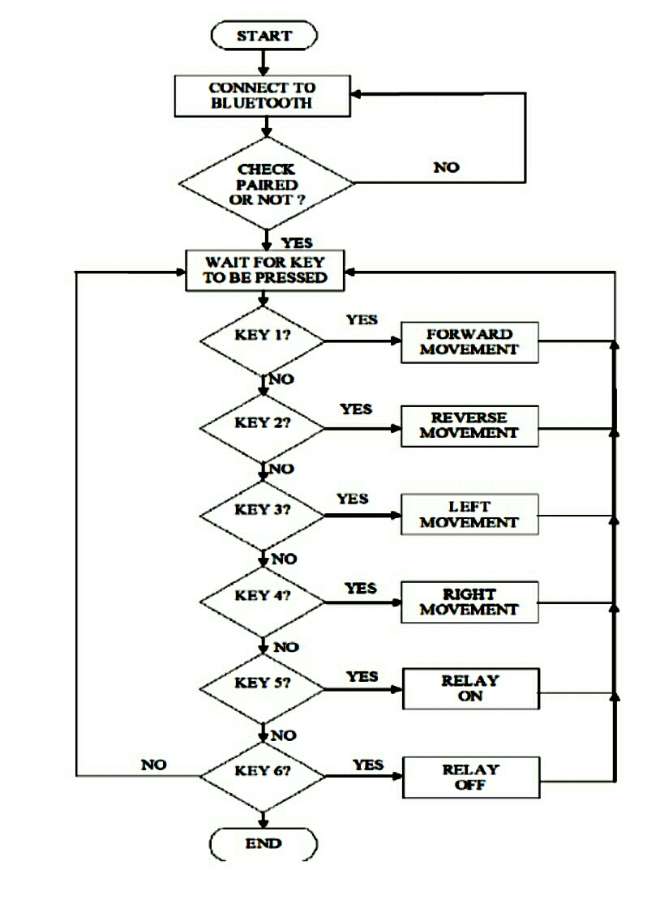 3. Six keys are used to navigate the project key1 (forward), key2(Reverse), key3 (left), key4 (Right), key5 (relay on), key6 (relay off).