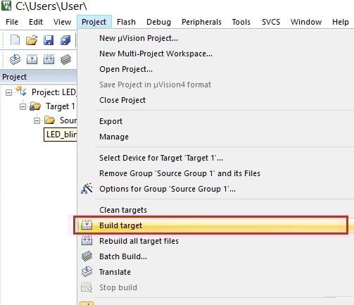 Now select the Project menu and click on “Build target”, it will build a project and give status in the Build output window with Error and Warning count if any.