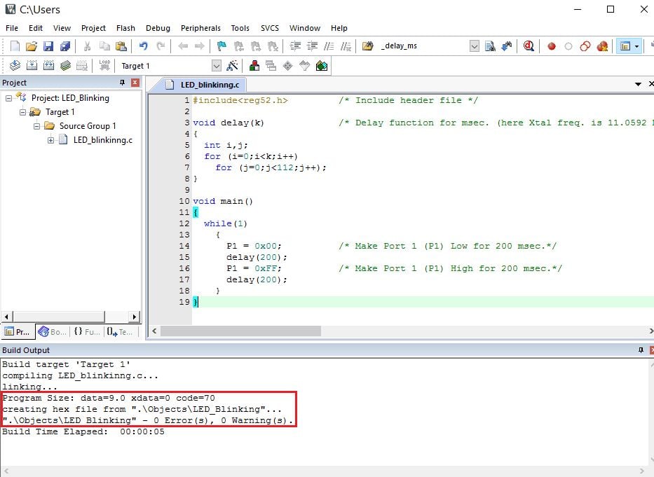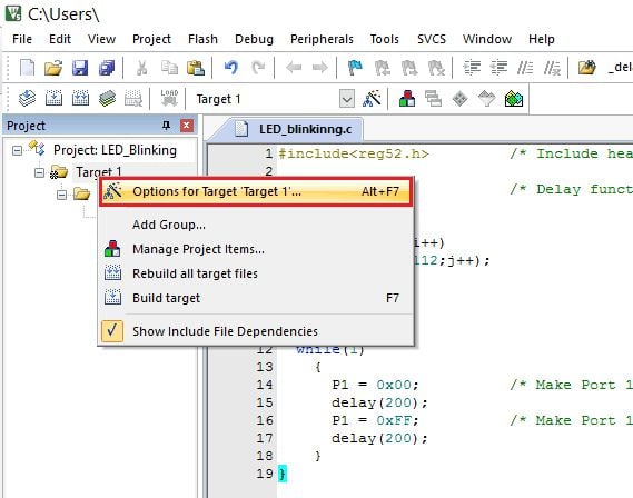 Let’s develop a simple LED blinking program using Keil µVision IDE with the C51 compiler. here we are using the AT89S52 microcontroller from 8051 families.