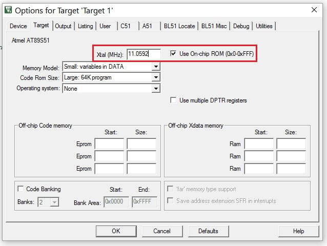 The target window will pop up, enter Xtal (MHz) frequency (here we used 11.0592 MHz), and tick mark in front of the “Use On-chip ROM” tag.