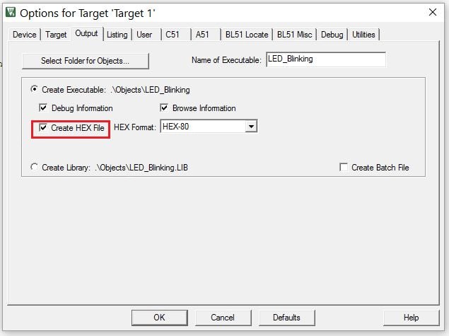 Within the same window select the “Output” option and tick mark in front of the “Create Hex File” tag and click on OK.
