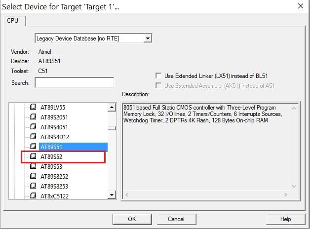 “Select Device for Target” window will pop up, select your device (here we selecting AT89S52)
