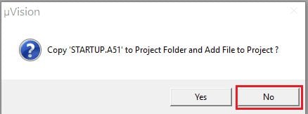 “µVision” window will ask for copy STARTUP.A51 to the project folder and add a file to the project (here is not necessary so we have selected No)