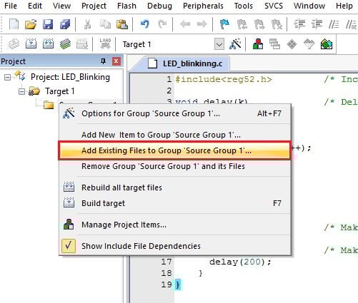 Right-click on Source Group 1 folder from Target 1 and select “Add existing files to Group ‘Source Group 1’”