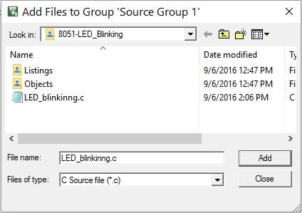 Select the program file saved with “.c “or “.asm” (in case of assembly language) and add it. Then close that window. You can see the added file in the “Source Group 1” folder in the left project window