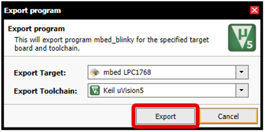 3. Select Keil uVision5 in Export Toolchain to and click on Export button.